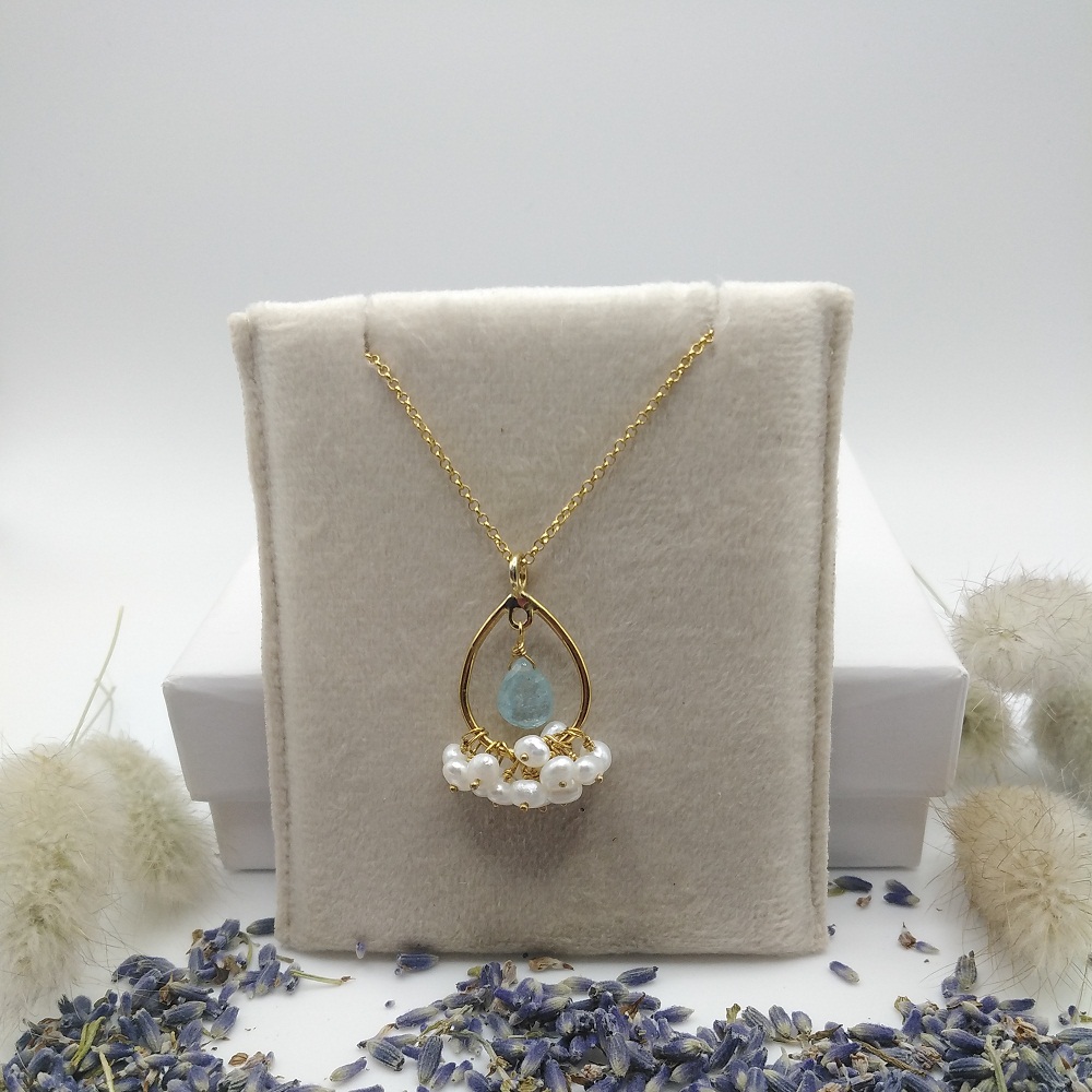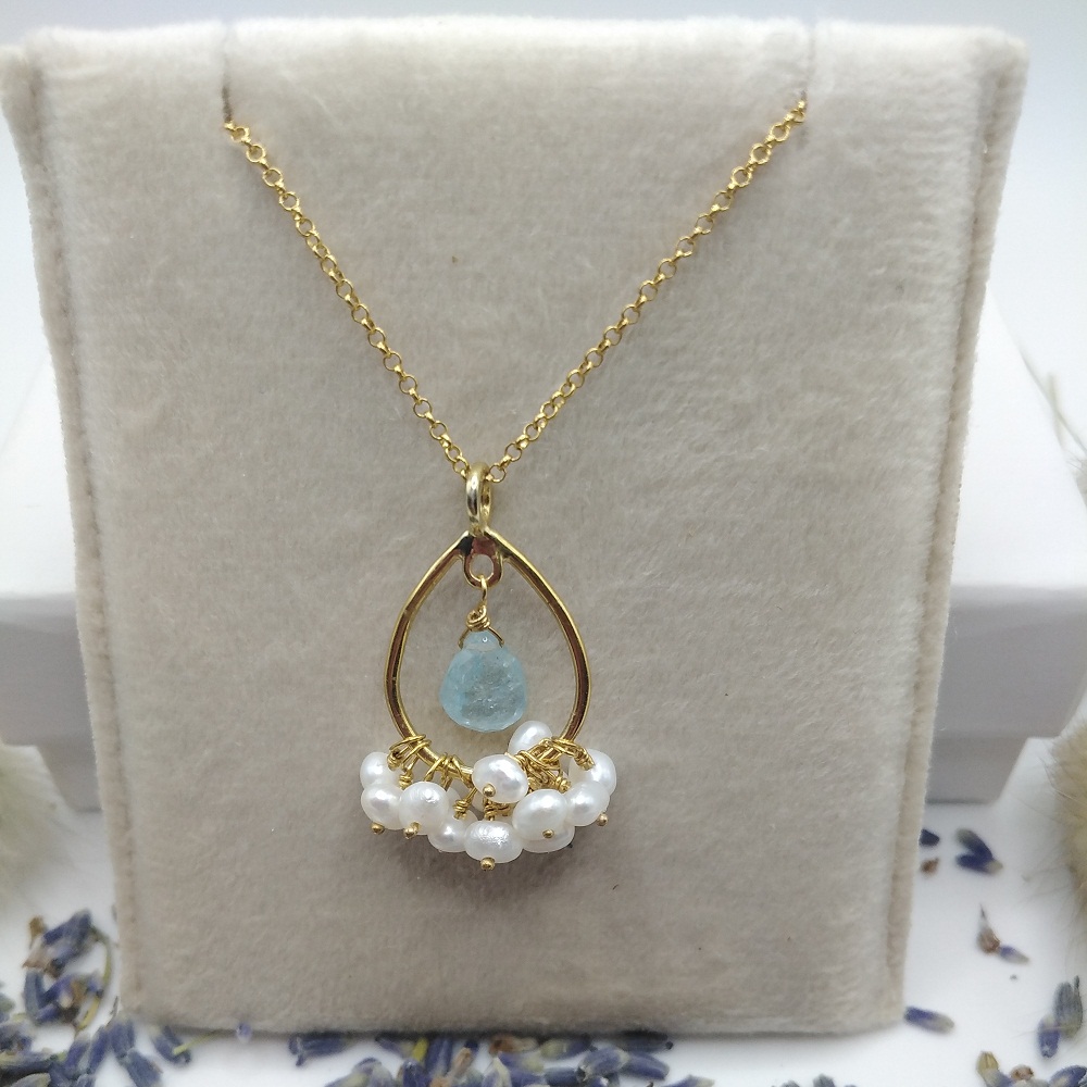 Αλυσίδα για το λαιμό από επιχρυσωμένο ασήμι 925 και ημιπολύτιμους λίθους Aqua Marinne και Μαργαριτάρια.