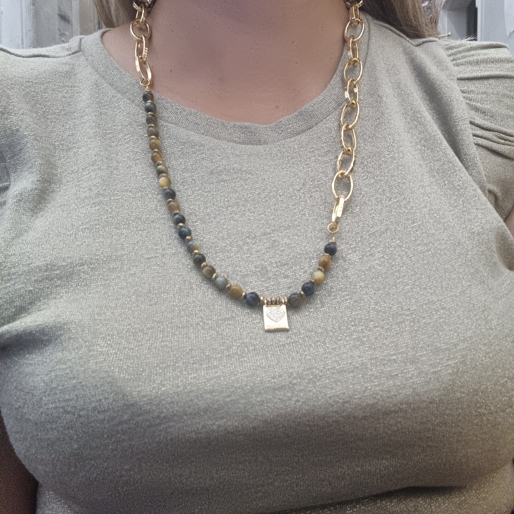 Χειροποίητο κολιέ με ορειχάλκινη αλυσίδα επιμεταλλωμένη και ημιπολύτιμους λίθους Μάτι της Γάτας και Αιματίτη, διακοσμημένο με ατσάλινο μοτιφ με στρας.