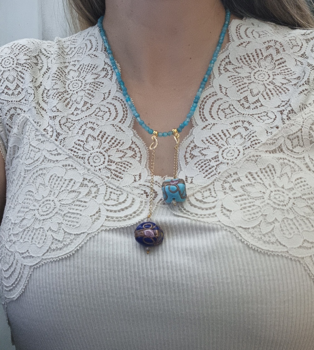 Κολιέ με πέτρες Murano ανάγλυφες και ζωγραφισμένες στο χέρι ,συνδυασμένες με ημιπολύτιμες πέτρες Νεφρίτη.