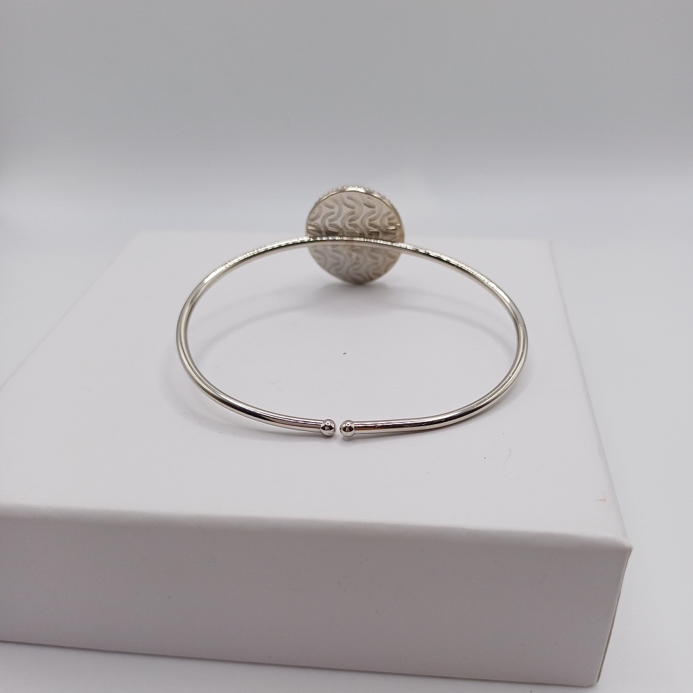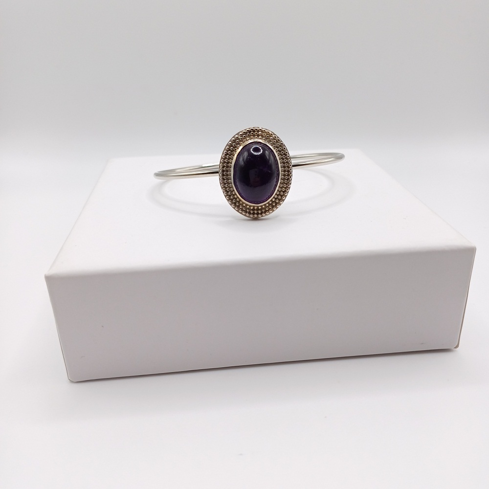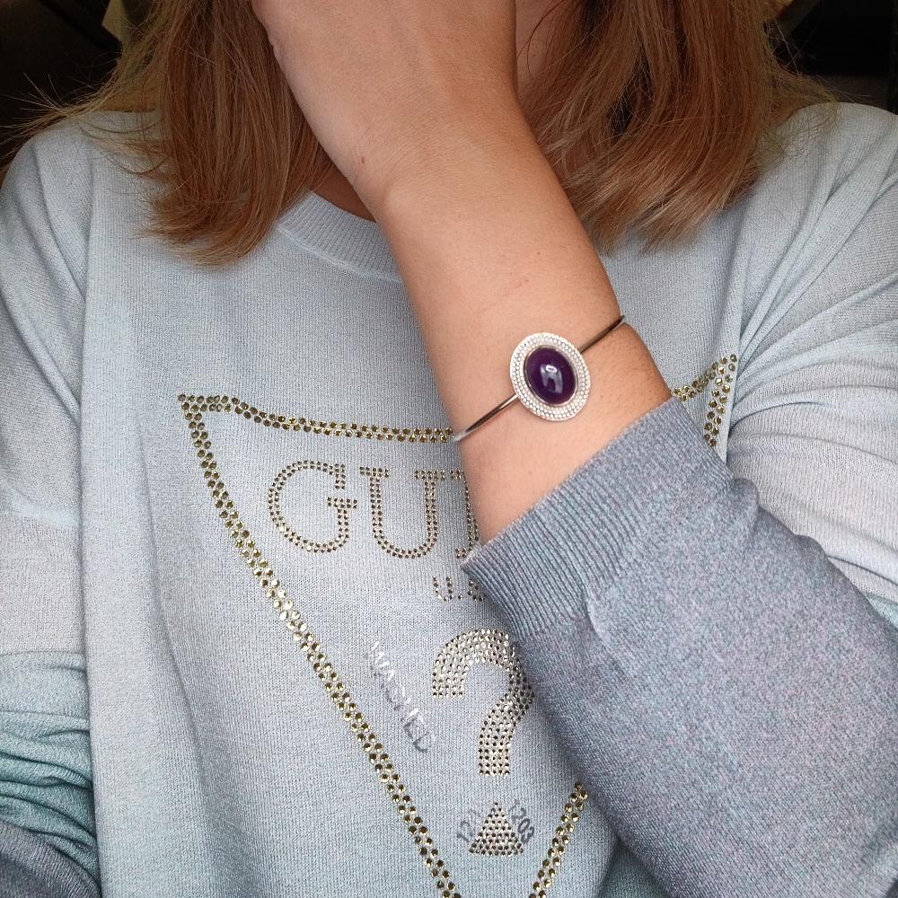 Χειροποίητο ορειχάλκινο βραχιόλι με ασημένια επιμετάλλωση, διακοσμημένο με ημιπολύτιμο λίθο Αμέθυστου.