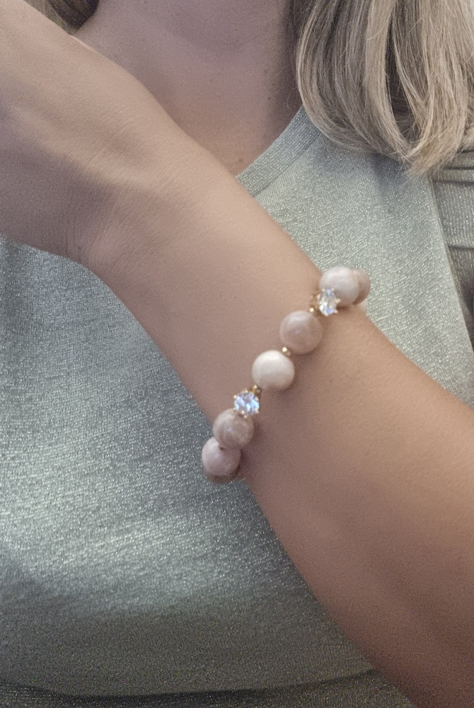 Χειροποίητο βραχιόλι με ημιπολύτιμους λίθους Ηλιόλιθου και Αιματίτη, διακοσμημένο με στρας.